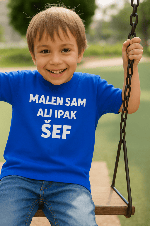 😂 Mali rastom, šef stavom! Dječja majica s natpisom MALEN SAM ALI IPAK ŠEF jasno pokazuje tko vodi pregovore oko crtića i zadnje kockice!