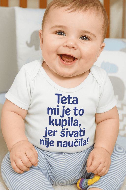 😂 Kad teta krene u shopping, beba dobije najjači outfit! Natpis “Teta mi je to kupila, jer šivati nije naučila!” garantira osmijehe. Savršeno za tetu koja želi ostaviti trag i bebu koja osvaja srca. 🎁