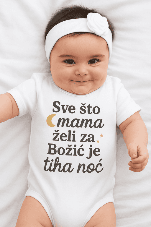 Kad je Božić, a beba ima noćnu smjenu, ovaj bodi sve kaže! 😄 Natpis Sve što mama želi za Božić je tiha noć garantira smijeh na svakom druženju. Idealno za prve blagdane bebe i roditelje s dobrim smislom za humor. 🎁
