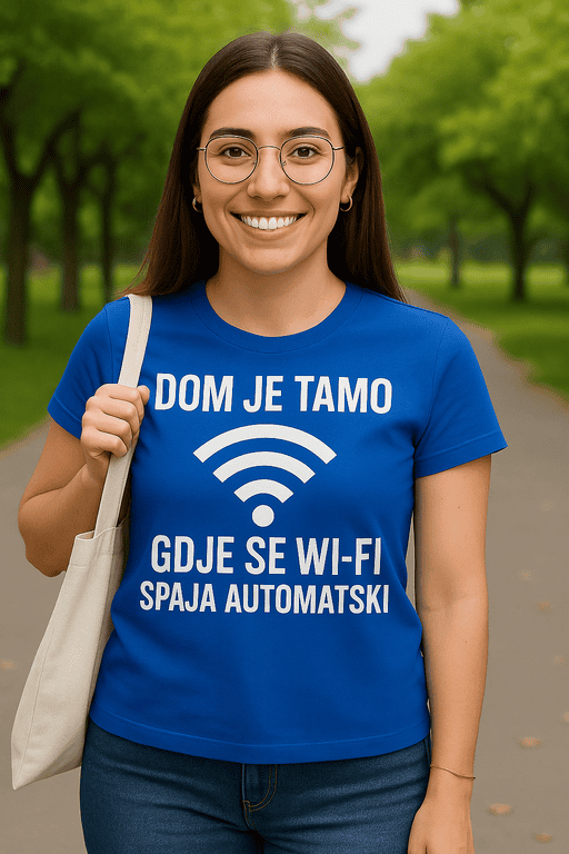 Zašto objašnjavati da ti je ljubav na prvom spajanju, kad majica sve kaže? Nosilac instant smijeha na faksu, poslu ili u kafiću — ti samo uđeš, Wi‑Fi te prepozna, a ekipa klimne: “Doma je!” Dostupno u više boja.