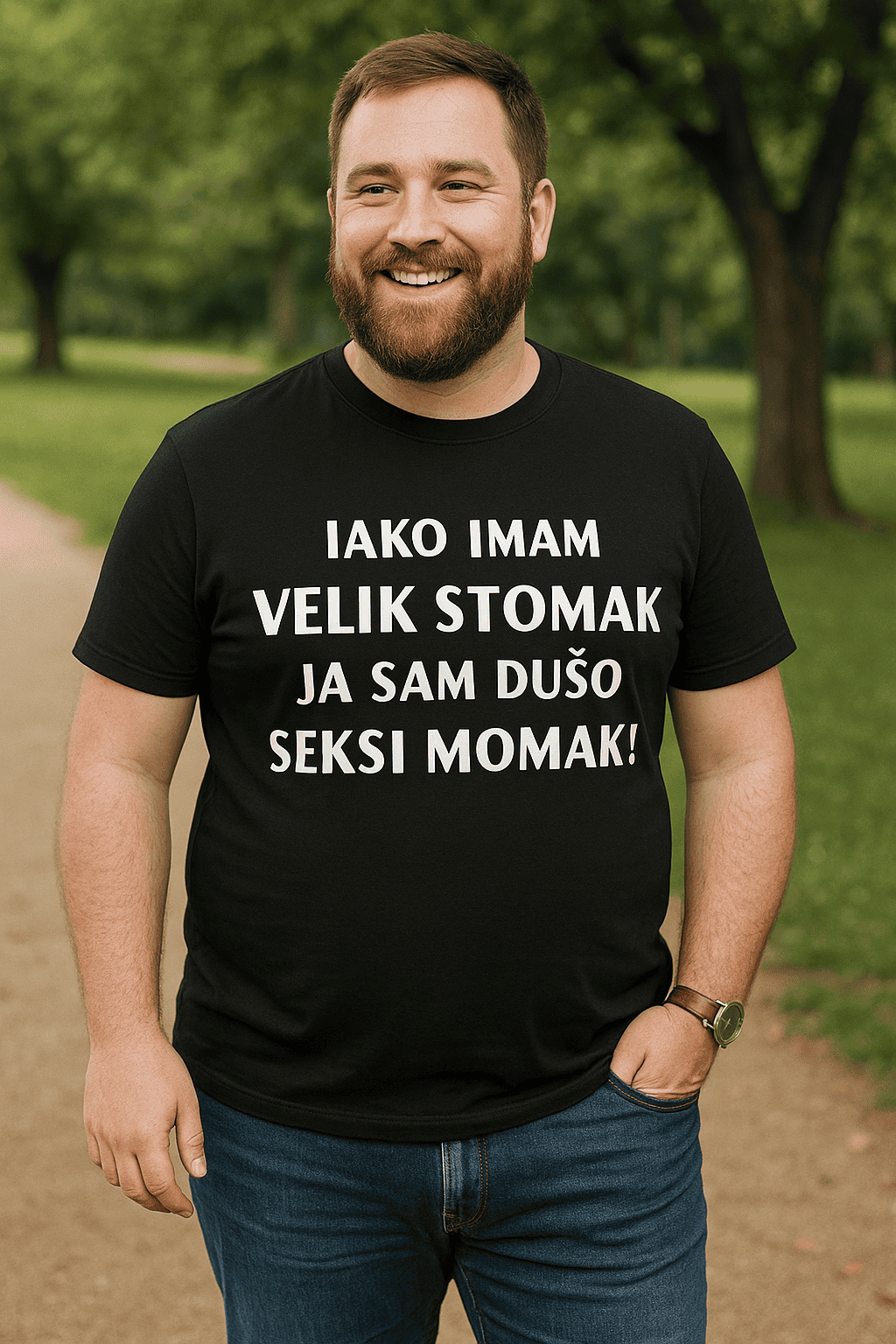 😂 Ova majica jasno poručuje: “IAKO IMAM VELIK STOMAK JA SAM DUŠO SEKSI MOMAK!” — i to s punim samopouzdanjem!