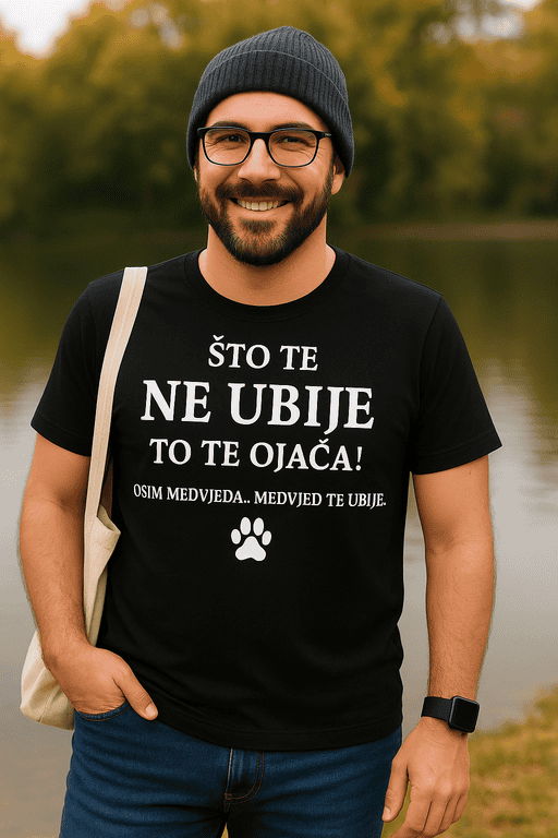 Treba ti majica jača od ponedjeljka? 😄 Natpis ‘ŠTO TE NE UBIJE TO TE OJAČA! OSIM MEDVJEDA.. MEDVJED TE UBIJE.’ idealan je za ekipu koja voli crni humor i glasne fore. 🐻