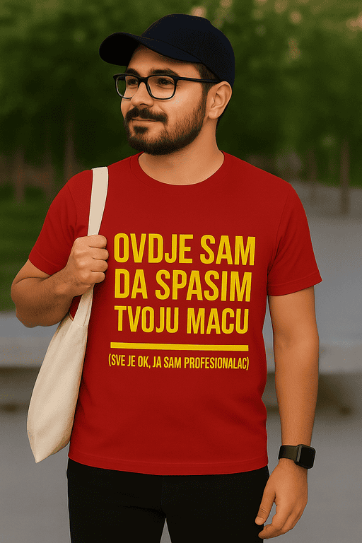 Uključi alarm za smijeh! 😄 Majica s natpisom “OVDJE SAM DA SPASIM TVOJU MACU (SVE JE OK, JA SAM PROFESIONALAC)” diže atmosferu brže od sirene. Idealna za vatrogasce, šaljivdžije i lokalne heroje. 🔥