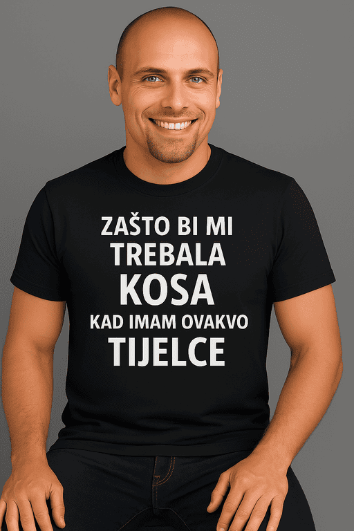🤣 Frizura? Preskačemo. Ova majica jasno poručuje: “ZAŠTO BI MI TREBALA KOSA KAD IMAM OVAKVO TIJELCE”!
