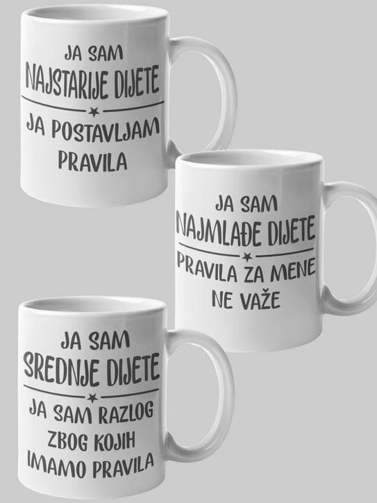☕🤣 Tri šalice, tri karaktera – a sve je već zapisano: JA SAM NAJSTARIJE DIJETE * JA POSTAVLJAM PRAVILA; JA SAM NAJMLAĐE DIJETE * PRAVILA ZA MENE NE VAŽE; JA SAM SREDNJE DIJETE * JA SAM RAZLOG ZBOG KOJIH IMAMO PRAVILA