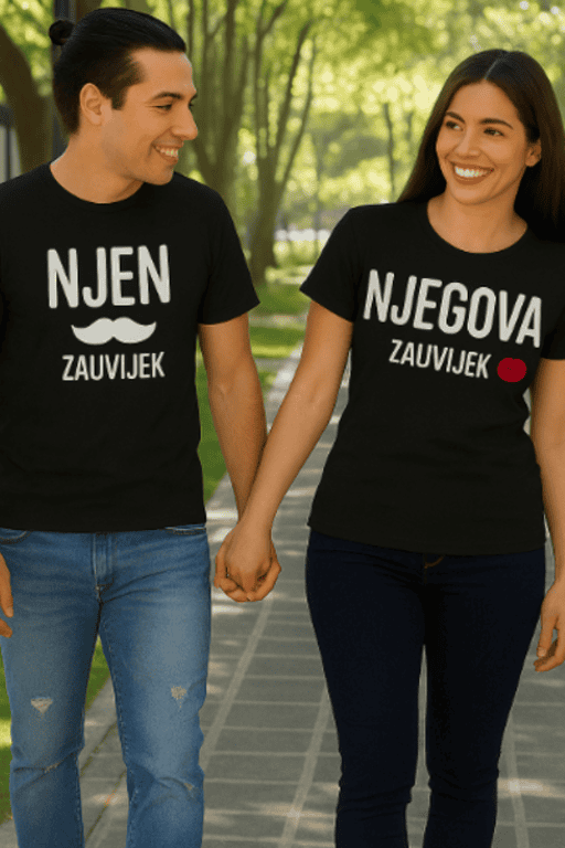 Status: zauzeti i ponosni! 😎 Komplet s natpisom NJEN ZAUVIJEK / NJEGOVA ZAUVIJEK pretvara vas u najslađi tim. Idealan za parove, godišnjice i Valentinovo. 💘