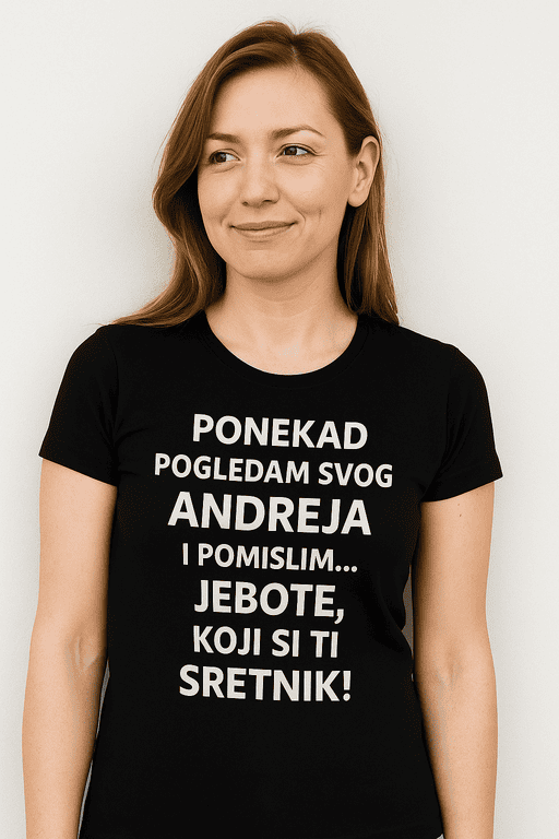 Tražiš poklon koji će nasmijati ekipu i pogladiti Andrejev ego? 😄 Ova majica s natpisom ‘PONEKAD POGLEDAM SVOG ANDREJA I POMISLIM… JEBOTE, KOJI SI TI SRETNIK!’ sve kaže umjesto tebe! 🎁 Idealna za sve koji vole dobar humor i znaju da je Andrej stvarno izvukao jackpot.