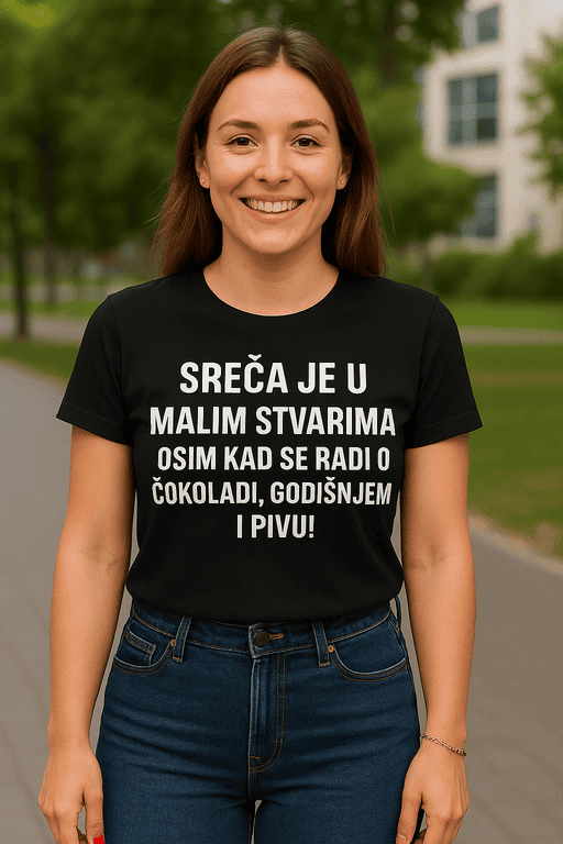 Kad ti kažu ‘uživaj u sitnicama’, pokaži natpis: SREĆA JE U MALIM STVARIMA OSIM KAD SE RADI O ČOKOLADI, GODIŠNJEM I PIVU! 😄 Idealno za ljubitelje čokolade, godišnjeg i piva te sve koji vole nasmijati ekipu. 🍫🍺🏖️